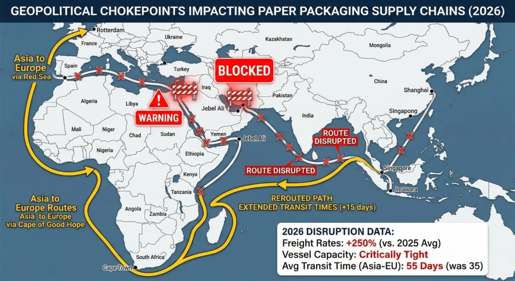 • Production Bottlenecks: Paper mills and packaging plants cannot operate at full capacity if they are waiting on delayed raw material shipments from Asia or the Middle East.